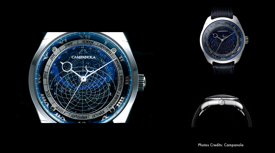 The Cosmosign (CTV57-1231) is a superb watch from the Campanola collection dedicated to astronomy enthusiasts or anyone with a passion for the skies. Within a beautiful craft 44 mm diameter glass-and-steel case, 1,027 stars, 166 star clusters and nebulas from the Andromeda galaxy and Orion’s belt are laid against the watch’s face, forming the celestial sphere as observed from 35 degrees north.